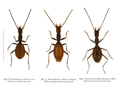 Three original scientific papers are published in journal Natura Croatica Vol 18. No. 2. 2009 with the description of four new species of cave beetles (Coleoptera). Two species are described from island Mljet: Euconnus longipedes from Galičnjak cave and Scydmoraphes speluncarius from Male ponte jama pit. One new species Tychobythinus lukici is described from Činjadra špilja cave from island Brač. New species Minosaphaenops croaticus is described from Glogova jama pit on Sniježnica Mt. near Dubrovnik. These new species are known so far only from their type localities, or from just few caves and represent new endemics of Croatian caves.