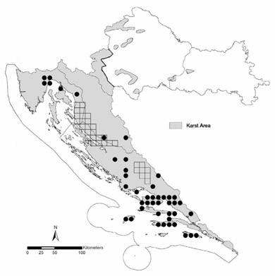 Altogether this paper presents data from 557 caves, 6 artificial underground structures and 15 other epigean and subterranean localities. A checklist of cave terrestrial isopod taxa in Croatia is composed of 35 species and five subspecies distributed in five families, including 22 Croatian endemic and 20 troglobiotic taxa.