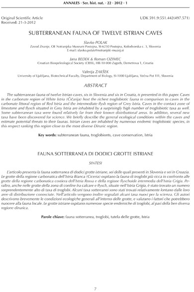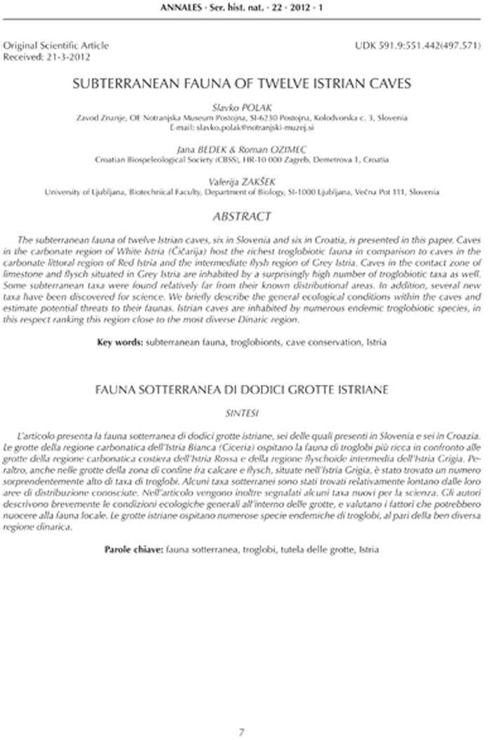 Polak, S., Bedek, J., Ozimec, R., & Zakšek, V. (2012): Subterranean fauna of twelve istrian caves. Annales: Series Historia Naturalis, 22, 1, 7-24.